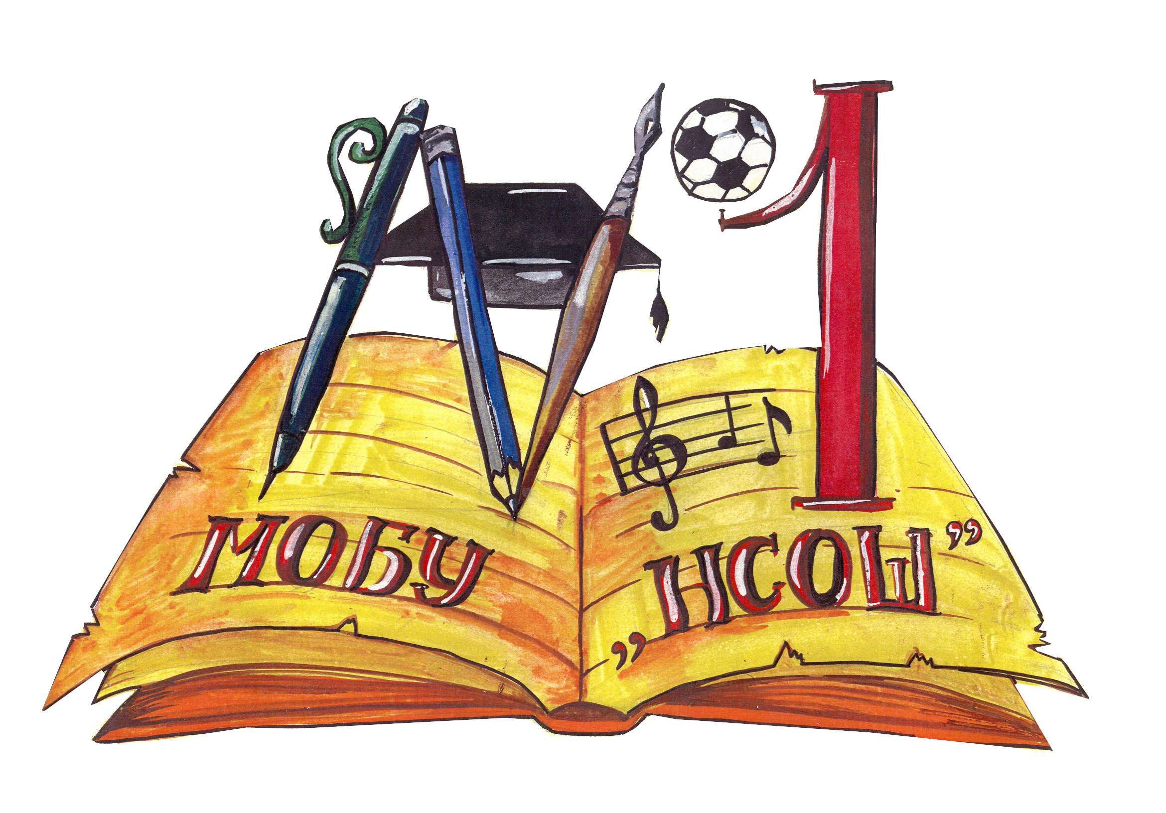 Герб: раскрытая тетрадь, на которой изображен нотный стан, название учреждения; номер нарисован в виде шариковой ручки, карандаша и пера, за номером - квадратная академическая шапочка и большая цифра 1 с футбольным мячом (автор герба выпускница 2007 года Гаршина Татьяна)